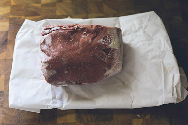 First, grab a frozen round roast and set it on your counter for about 30 minutes. Slicing a frozen roast is MUCH easier than if it is thawed. Next, grab a serrated knife and slice your round roast into thin pieces. I wanted to be sure they were thin enough for the salt to penetrate the entire piece.