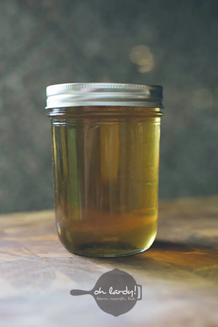 Pour your lard into a jar and allow to cool. See that golden color? I think it is too golden. I know that rendered lard will have a golden color, just not so dark. I popped my jar in the fridge.