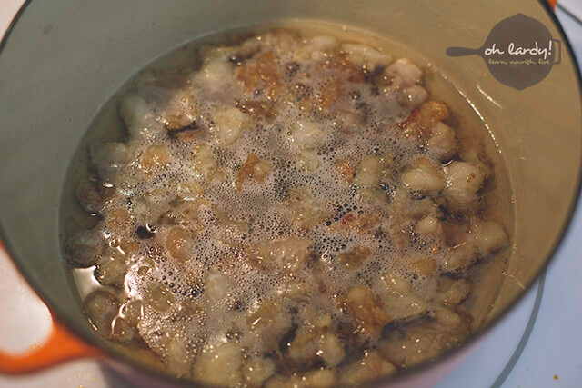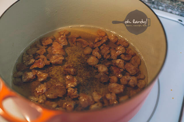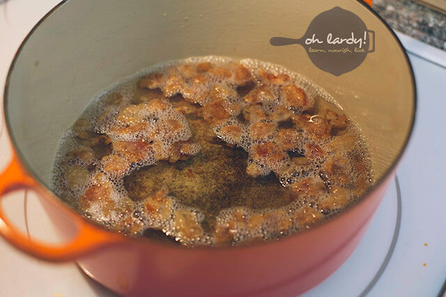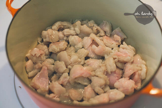 Throw your fat into a heavy bottomed stockpot along with some water. For this recipe I had about 1 and a quarter pounds of fat and used ¼ cup of water. Turn your burner on low and watch your lard render. To be clear, I kept my burner set just above low. I was nervous about burning the fat. The low temp worked out well for me. You can stir it every so often as well.