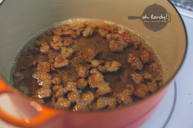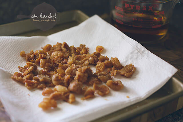 Finally! 2 and a half hours later, my cracklings finally sank indicating that the rendering process is complete!