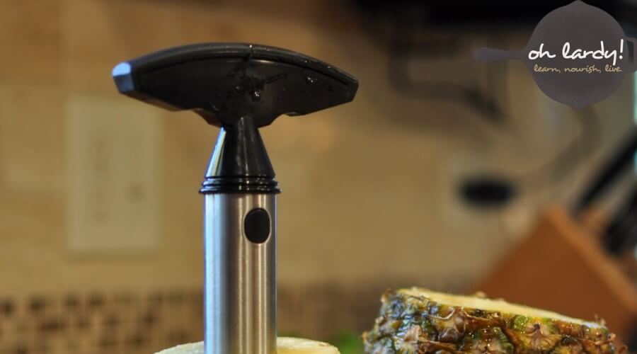 For this recipe you need approximately 3 cups of fruit, papaya and pineapple. I find it most cost effective to buy whole pineapples and cut them at home. I found this handy dandy tool called a pineapple corer/slicer that makes this job a breeze!